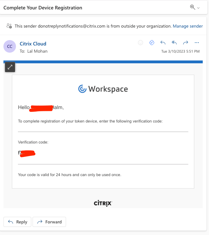 The email from Citrix with the verification code will look like the below and is valid for only 24 hours.