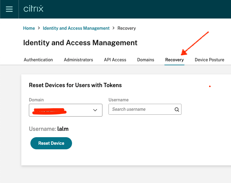 If your service desk wants to reset an end user device due to whatever reason, they can navigate to the Recovery tab under Identity and Access Management in cloud portal. Choose the domain and search for the user name