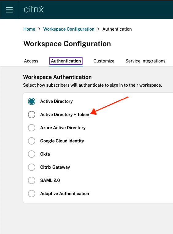 Now you will need to head over to the Workspace Configuration as below. This is where you enable 2 factor for your subscribers consuming apps and desktops